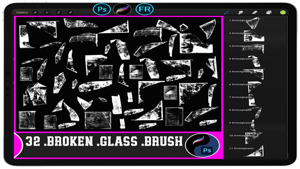 This is a brush set that allows you to create realistic "cracked glass" effects. It includes a variety of designs, such as transparent shards, cracks, and shatter effects.