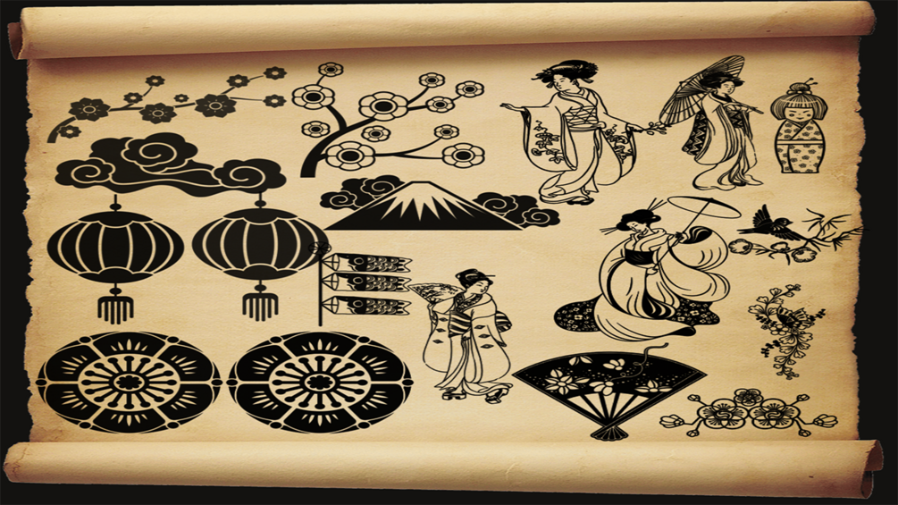 This is a brush set featuring traditional Japanese culture. It includes a wide variety of motifs essential for Japanese-style designs, such as people wearing kimonos, fans, parasols, koi fish, fox masks, torii gates, and cherry blossoms.