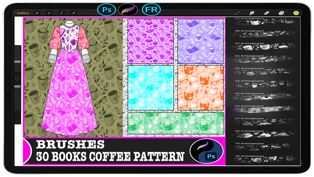 Compatible with Photoshop and Procreate, this set is versatile and can be used for a wide range of applications, including textile design, paper crafts, cards, wrapping paper, fan magazines, and backgrounds. It's a convenient resource for easily creating a cafe-inspired look.